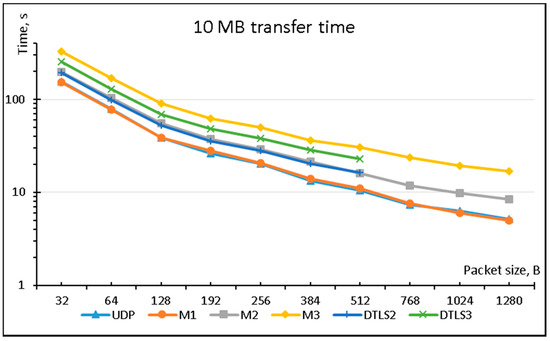Figure 3 compares the performance of the six aforementioned protocols with respect to transmission time while transferring 10 MB of data using different packet lengths. The plain UDP is the best performer, but Mode 1 implementation of LSSP method is a very close competitor and additionally provides data source authentication. The difference in performance of plain UDP and M1 is caused by computational overhead introduced by additional calculations performed on the sending device. The total amount of plain data sent through the network interface is exactly the same in both cases, but time taken to send all the packets is slightly bigger in the case of M1. For example, it takes 10.5 s to send 10 MB in 512 B data packets using UDP and 11 s using M1.