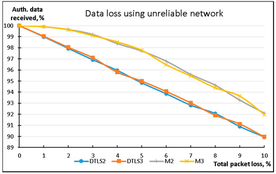 During this experiment, only DTLS2, DTLS3, M2, and M3 were used. Ten MB of data was transferred from the streaming device using 256 B packets. Results show that both the M2 and M3 modifications of the LSSP method provide significantly less overall data loss in poor network conditions by using redundant data packets for missing data restoration at the receiving side.
