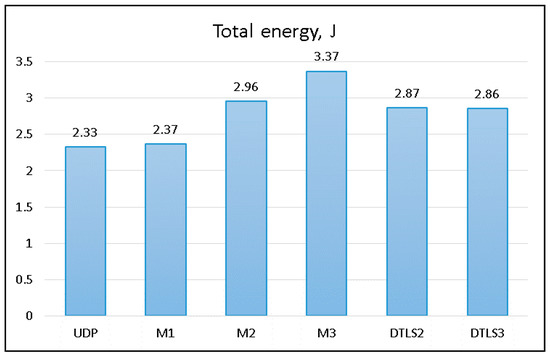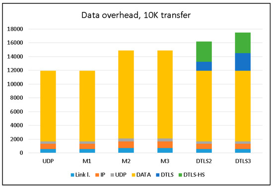 To evaluate the data overhead imposed by all protocols under evaluation, we transferred 10 K of data from the streaming device and used Wireshark to capture all packets at the receiving device, and then calculated the total sizes of the packets “on-wire”. The results are summarized in Figure 7. Only packets originating at the streaming device (client in the terms of DTLS) are considered in this chart. The handshake phase of the DTLS protocol imposes some traffic passed from the server to the client.
