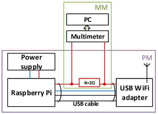 Energy consumption measuring. PS—power supply, PM—end device prototype module, MM—energy measuring module.