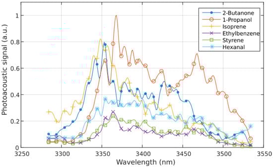 The PLS model was configured to calculate six principal components (PLS factors), each representing the contribution of one substance to the overall spectrum. In order to calculate the six variables, the number of reference spectra must be larger than six. The measured spectra of the six single VOCs in nitrogen (each 100 ppm) represented the first reference dataset. Each spectrum comprises the photoacoustic signals at 301 different wavelengths. The six spectra are shown in Figure 2. The photoacoustic signal is given in arbitrary units (a.u.) as the microphone outputs digital values.