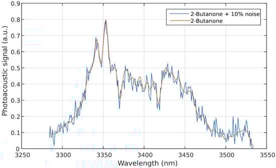 Additional reference spectra were synthetically generated by combining variations of the single VOC spectra. For this, we scaled the original measurements with the factors 0, 0.3, 0.7, or 1, and we added them to one another in all possible combinations. This resulted in a total of 46 = 4096 reference spectra. The scaling “generated” concentrations of 0 ppm, 30 ppm, 70 ppm, and 100 ppm for each VOC. In order to consider the fluctuation of the photoacoustic signal and to improve the robustness of the model, Gaussian noise was added to the six original spectra. A long-term measurement of the photoacoustic signal at a constant wavelength resulted in an amplitude fluctuation of approximately 5%. Therefore, we decided on a noise power of 10% of the spectrum power, which is defined as the root mean square (RMS) of all measuring points. An example of spectra with and without additional noise is shown in Figure 3.