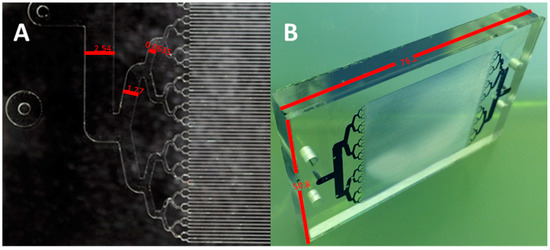 (A) Hot-embossed PMMA substrate with dimensions of 2.54 mm, 1.27 mm, and 0.635 mm from left to right. (B) Thermally annealed microfluidic device (L × W; 76.2 mm × 50.8 mm). Trypan blue dye added to the channels to delineate microchannels.