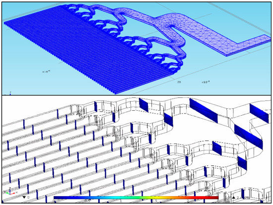 Laminar flow simulations at flow rates of 0.1 to 10 mL/min in steps of 0.5 mL/min were conducted with COMSOL Multiphysics (Burlington, MA, USA, Figure 2). In this simulation, 1/8 of the proposed geometry was imported into COMSOL (since the planes of symmetry served to diminish computing time and memory). A stationary solver and a free tetrahedral mesh element with corner refinement were used. The mesh elements sizes ranged from 8.28 × 10−4 m and 1.76 × 10−4 m, respectively. The boundary conditions at the inlet consisted of laminar inflow with an initial flow rate of 0.1 mL/min. The walls of the microfluidic were no slip boundaries.