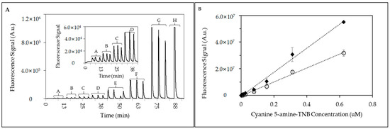 Fluorescence dye profiles of Cy5-Amine-TNB at flow rates of 1.0 mL/min and 2.0 mL/min were recorded and plotted (Figure 3A,B). Results showed similar peak profiles in shape and amplitude as also seen in prior reports [10]. An immediate rise in the fluorescence signal over background upon excitation of the fluorescent complex (Cy5-amine-TNB) was observed. Minimal peak tailing was observed which traditionally indicates a diminishing concentration of the Cy5-amine-TNB as the fluorescent probe exits the flow cell chamber. Detectable concentrations of Cy5-amine-TNB were clearly measurable above the baseline from the lowest concentration applied 3.0 nM to 625 nM (Figure 3A). Figure 3A (inset) displays lower concentrations of applied Cy5-amine-TNB. Total fluorescence (peak area) observed at dye concentrations of 3.0 nM at flow rates of 1.0 and 2.0 mL/min were 334527 and 93349, respectively. Linear plots (Figure 3B) and calculated regression coefficients (R2) provided values of 0.994 and 0.991, respectively.
