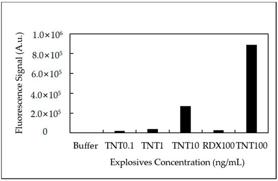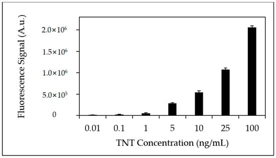 Figure 5 depicts a bar plot of the fluorescence signal response from the TNT microchanneled microfluidic device with applied TNT concentrations (0.01–100 ng/mL). Fluorescence signal responses displayed an exponential rise with a calculated R2 equal to 0.999 with %RSD <5%.