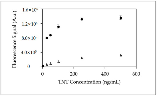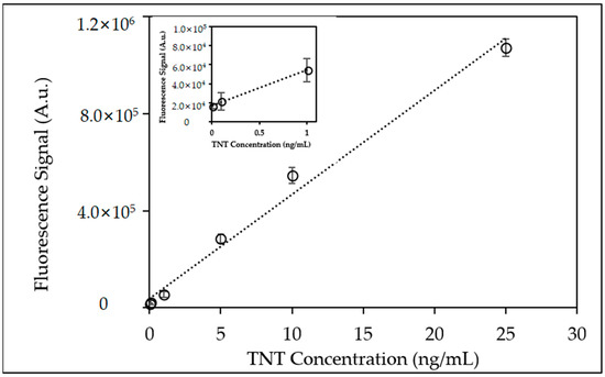 Figure 6 shows a scatter plot of the fluorescence signal responses shown in Figure 5 at the lower TNT concentration range (0.01–25 ng/mL). Results displayed a linear dynamic range that exists over four-orders of magnitude with a percent standard deviation (%RSD) <5%.