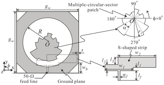 In this paper, we propose the design of a microstrip-fed broadband CP slot antenna. By embedding an S-shaped strip, which is attached to the signal line, CP radiation is attained [13]. The CP bandwidth is then significantly enhanced by loading a multiple-circular-sector patch inside the slot to serve as a perturbation structure that can generate two orthogonal modes with identical amplitudes and in-phase quadrature components. As a result, the 3 dB ARBW of the proposed antenna is enhanced by as much as 70.55% and is completely enclosed by a −10 dB reflection bandwidth of 81.06%. The measured CP operating bandwidth of the proposed antenna is 1.89–3.95 GHz, covering the operating frequency bands of the following systems: Bluetooth/WLAN (2.4–2.484 GHz), LTE band 1 (2100 MHz), and LTE band 7 (2600 MHz). In addition, it is also important to note that the proposed antenna can be directly scaled in order to work with other frequency bands. The proposed antenna with the key features of a more compact size and a broader 3 dB ARBW can be considered as an ameliorated design of an earlier antenna [14] that also uses the multiple-circular-sector configuration. Details of the antenna design and the experimental results are presented and discussed in the following sections.