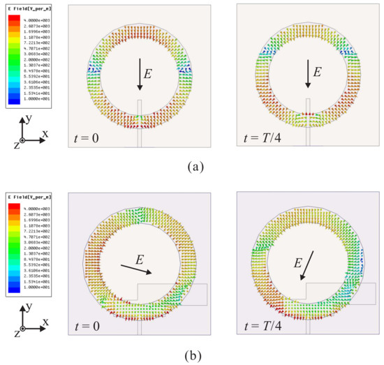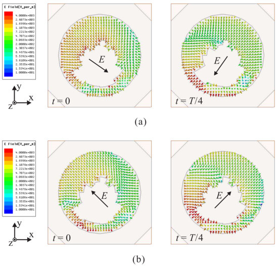 Figure 4 shows the time-varying electric field in the slot, as observed from the +z-direction, of Antenna-A and Antenna-B at t = 0 and T/4 for 3 GHz. For Antenna-A, it is found that the electric field direction does not change as the time t is increased, as illustrated in Figure 4a. This confirms that Antenna-A is a linearly polarized antenna. Meanwhile, for Antenna-B, the electric field direction changes with an increase in the time t (see Figure 4b). The sum vectors of the dominant electric field components at and are orthogonal and rotate in a clockwise fashion, generating LHCP operation at 3 GHz. In addition, because the mitered corners have a minor effect on the performance of the antenna, the electric field distributions of Antenna-C and the proposed antenna are nearly identical. Therefore, Figure 2 also illustrates the electric field distribution in the slot of Antenna-C. As shown in Figure 2, when loading the multiple-circular-sector patch instead of the circular patch, circular polarization can be achieved at different frequencies, resulting in a broad CP operating bandwidth. This verifies the results shown in Figure 3b.