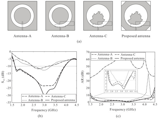 (a) Design process of the proposed antenna; (b) Simulated reflection coefficient; (c) Simulated axial ratio (AR).