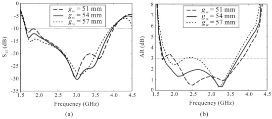 Figure 5 shows the effects of the ground plane size on the reflection coefficient and AR performance. The reflection coefficient levels at the lower frequencies are improved while the −10 dB reflection bandwidth shows a slight decrease with an increase in the value of (see Figure 4a). As shown in Figure 4b, varying has considerable effects on the AR performance. When = 51 mm, the AR value around 1.9 GHz increases until it exceeds 3 dB. Meanwhile, the CP performance was found to decline at approximately 2.5 GH when exceeded 57 mm. Thus, the value of is set to 54 mm.