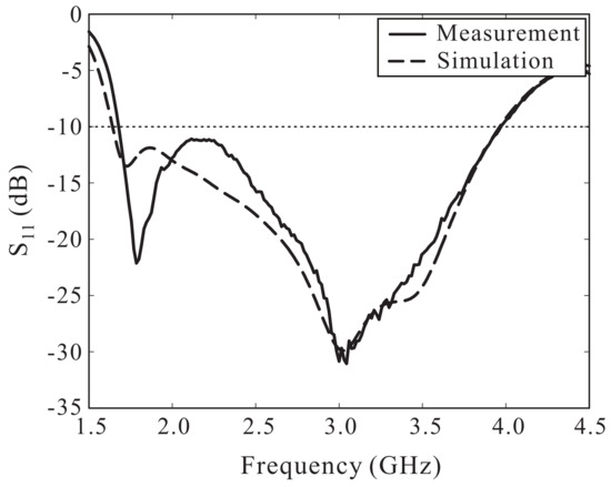 Based on the optimized dimensional parameters listed in Table 1, an antenna prototype was fabricated for measurement. Figure 7 shows a photograph of the fabricated antenna, with overall dimensions of 54 mm × 54 mm × 0.8 mm. The measurement of the reflection coefficient was done using an Agilent 8510C vector network analyzer and the result was compared to the simulated result, as illustrated in Figure 8. The simulated result is in good agreement with the measured result. A −10 dB reflection bandwidth of 81.06% (1.68–3.97 GHz) was found during the measurement as compared with the bandwidth of 82.86% (1.64–3.96 GHz) determined via the simulation.