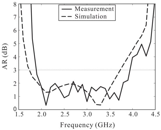 Simulated and measured axial ratios (ARs) versus the frequency.