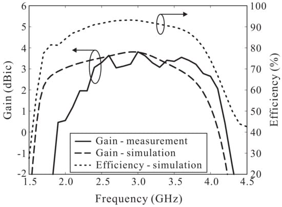 The simulated and measured ARs versus the frequency are shown in Figure 9. The simulated and measured 3 dB ARBWs in the broadside direction ( = 0°) were found to be 72.76% (1.74–3.73 GHz) and 70.55% (1.89–3.95 GHz), respectively. Note that the 3 dB ARBW is entirely enclosed by the −10 dB reflection bandwidth. The simulated and measured LHCP gains of the proposed antenna are illustrated in Figure 10. Within the measured 3 dB ARBW, measured LHCP gain varies from 0.46 to 3.81 dBic. Reasonable agreement between the simulation and measurement outcomes was noted, along with some discrepancies caused by fabrication imperfections and/or experimental tolerances. In addition, Figure 10 shows the simulated antenna efficiency, which ranges from 80% to 93% within the 3 dB AR band.