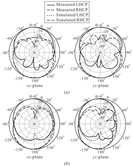 The results of the simulated and measured normalized radiation patterns on the - ( = 0°) and - ( = 90°) planes for 2.1 GHz and 3.5 GHz are displayed in Figure 11. It can be observed that the proposed antenna radiates a bidirectional wave with opposite circular polarization. LHCP is realized in the -direction, while RHCP is radiated in the -direction. In addition, the radiation patterns are asymmetric and somewhat titled, which is mainly caused by the asymmetrical design of the proposed multiple-circular-sector patch. Note that for realizing unidirectional radiation and improving the antenna gain, a metallic reflector can be placed underneath the proposed antenna at a proper distance (approximately one quarter wavelength at the center frequency of the CP band).