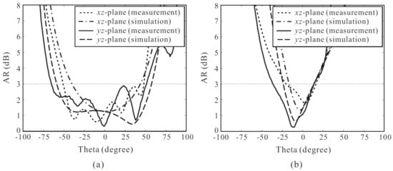 Simulated and measured axial ratios (ARs) of the proposed antenna versus the observation angle: (a) 2.1 GHz; (b) 3.5 GHz.
