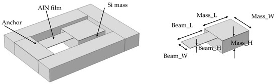 In order to get the most accurate results, a model has been created in COMSOL, in which a triangular swept mesh was used. In order to compare the results between experimental and simulation results, the beam was anchored to the surrounding silicon substrate and an air bubble around the device was used to take into consideration air damping effects. The structures were fabricated in a commercial MEMS technology: PiezoMUMPs from MEMSCAP. For this reason, the studies were limited to the structures that could be realized using this process. Therefore, a limitation on the values of the parameters, due to the fixed thicknesses of the materials used, has been considered. The value of Beam_H has been defined as 10 μm, and Mass_H can only take two different values 10 μm or 400 μm, the latter possible if the handle portion of the substrate is kept below the T-shaped mass. The piezoelectric material used is aluminum nitride (AlN). The design variations in the dimension ratios of the mass length to the beam length and the mass width to the beam width are illustrated in