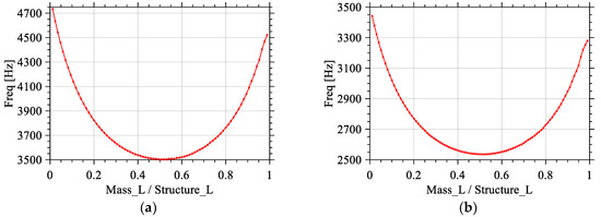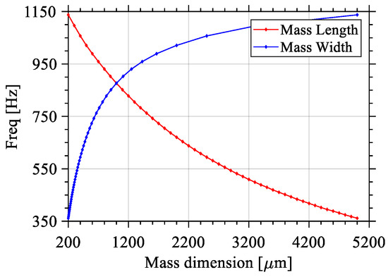 Another set of simulations was carried-out with the following parameters: the total length of the structure (Structure_L) and thickness (Beam_H and Mass_H) of the silicon structure are kept to 2000 μm and 10 μm, respectively. The length of the mass to length of the structure ratio (Mass_L/(Mass_L + Beam_L)) changes from 0.01 to 0.99 by setting Mass_L from 20 to 1980 μm. Beam_W was chosen to be equal to half of Mass_W (i.e., 400 μm and 800 μm respectively). As a result, in that case, the total area of the proof mass (Mass_L × Mass_W) changed from 0.016 mm