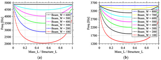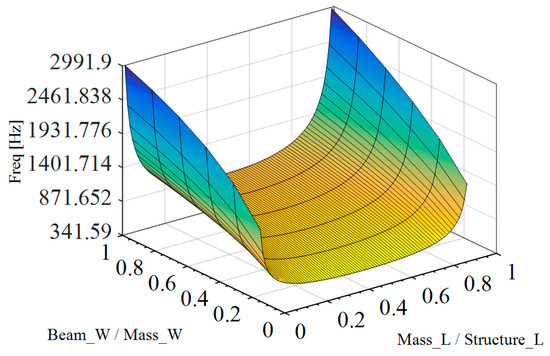 In this set of simulations, the total length of the structure (Structure_L) and thickness (Beam_H and Mass_H) of the silicon structure are kept to 1700 μm and 10 μm, respectively. The length of the mass to length of the structure ratio (Mass_L/Structure_L) is varied from 0.01 to 0.98 by setting Mass_L from 20 to 1680 μm. Regarding the value of Mass_W, it was kept at 600 μm while using the value of Beam_W to explore different ratios for Beam_W/Mass_W such as 1/6, 1/3, 1/2, 2/3, 5/6, and 1, which results in Beam_W values of 100, 200, 300, 400, 500, and 600 μm, respectively. These different ratios allow a reduction of up to 2.2, 1.7, 1.2, 0.7, 0.3, and 0 kHz, respectively. The maximum reduction is reached when the length of the beam represents half of the total length of the structure for each given Beam_W, as seen in