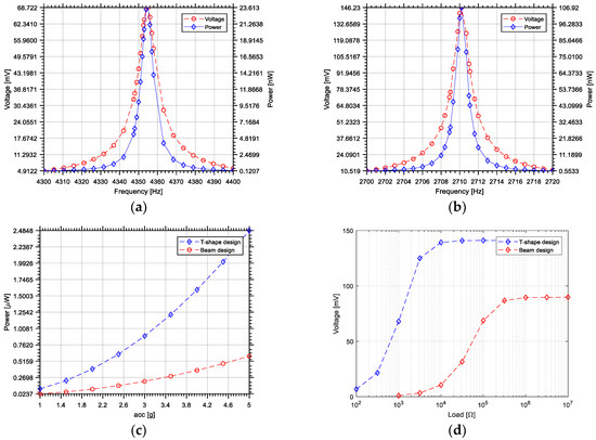 Figure 9a,b show the output voltage and power for both designs. Here, an acceleration of 1g along the z-axis and a resistive load of 100 kΩ are used in the simulations. The at-resonance voltage difference in the two designs of 69 mV (beam design) and 146 mV (T-shaped design) translates to an output power of 24 nW for the reference beam design to 107 nW for the optimized T-shaped design. The output power at resonance, for both designs versus the acceleration is depicted in