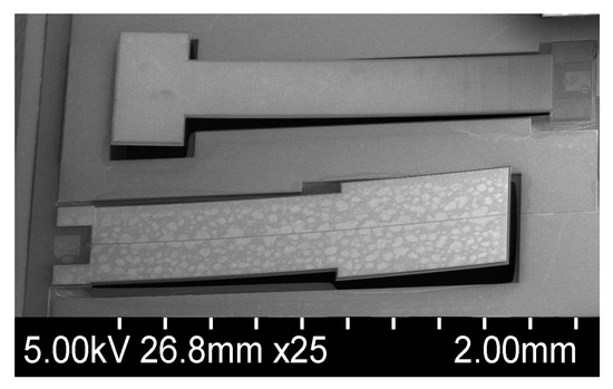 20], in which an array of of narrow positive and negative electrodes are placed on the piezoelectric surface when it is fabricated. The fabricated structures are such that Design 2 is interdigitated while Design 1 is not. It can be noticed that the intrinsic stresses in the thin films are responsible for the out-of-plane upwards bending behaviour. This stems from the difference between the intrinsic stress of the deposited thin films and the crystalline silicon structure that has very low intrinsic stress. This deformation was not observed to have a significant impact on the resonant frequency of the devices characterized in this work, as measurements of identical structures showed a good stability of the resonance frequency between devices and a close match to the results was obtained in simulations.