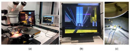 To test the fabricated prototype devices and acquire experimental data, the following process has been followed. The first step was to study the Eigen frequencies of the structures using COMSOL in order to gain insight into the expected resonance frequency of the devices. Then, using a vector network analyzer (VNA) (Model E5061B from Keysight, Santa Rosa, CA, USA), the values of the resonant frequencies were measured. The block diagram of the test setup is shown in