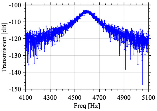 Figure 14, outlining the resonance frequency, bandwidth and the Q-factor. The bandwidth is measured to be about 63.3 Hz with a resonant frequency of 4.6 kHz and quality factor 72.7. The damping ratio is calculated to be ζ = 1/2Q = 0.007.