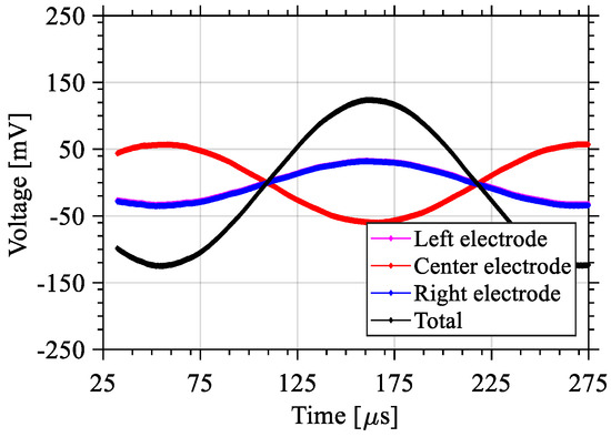 The response of the system when subjected to a sinusoidal excitation at a given frequency was characterized. An accelerometer from PCB Piezotronics (Depew, NY, USA) (model 352C65) was used to quantify the acceleration of the piezo speaker. The sinusoidal excitation of the piezo speaker has an amplitude of 10 V and a frequency 4350 Hz. This resulted in an acceleration 8.4g of the piezo speaker, and the generated power across the 1 MΩ oscilloscope load was measured to be 62 nW. The output voltage for the left, right, and center electrodes are shown in