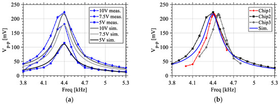Figure 16b shows the generated voltages of three different dies of the same design outlining the process variation in terms of performance with an excitation voltage amplitude of 10 V with respect to simulation results, also showing a good correspondence with the measurements. Based on the measurement data received, the models had been revisited and optimizations had been performed for more accuracy in the fabrication of the prospective designs.