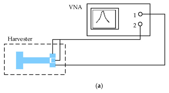 To test the fabricated prototype devices and acquire experimental data, the following process has been followed. The first step was to study the Eigen frequencies of the structures using COMSOL in order to gain insight into the expected resonance frequency of the devices. Then, using a vector network analyzer (VNA) (Model E5061B from Keysight, Santa Rosa, CA, USA), the values of the resonant frequencies were measured. The block diagram of the test setup is shown in Figure 12, while the experimental test setup is shown in Figure 13.