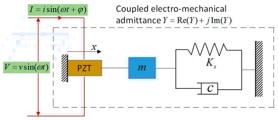 The EMI theoretical model was proposed by Liang et al. [36] and subsequently modified by many scholars [37,38,39,40]. The principles of the EMI-based damage monitoring technique employ both the direct and converse piezoelectric effect, in which one single PZT patch serves as both a sensor and an actuator, synchronously. The self-sensing property of piezoelectric material allows the PZT sensor to obtain frequency response functions between the input voltage and output current. Depending on the direct and converse effect of piezoelectric materials, the basis of the EMI technique is that the EMI signal received from the PZT sensor is directly related to the mechanical impedance of the host structure and is affected by the presence and growth of structure damage [34]. As shown in Figure 1, for a one-dimensional electro-mechanical system, the PZT sensor excites its host structure with a high-frequency band, and the impedance signature can be measured. The structural integrity can be qualitatively detected by sensing the electrical impedance or admittance of the piezoelectric transducers bonded on, or embedded into, the host structure and observing the changes to the signatures of measurement visually.