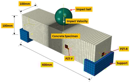 The three-dimensional finite element model is illustrated in Figure 2. The specimen as depicted in the figure has cross-sectional dimensions of 400 mm in length, 100 mm in width, and 100 mm in height, which is fixed on the rigid supports. In the numerical simulation, the concrete beam was impacted by a steel ball which was considered to be a rigid body. The ball with a mass of 1.4 kg dropped freely onto the top surface of the concrete beam at mid-span from the height of 1.25 m. The beam was subjected to 12 times of repeated impact loadings at the same falling height until the concrete beam fractured completely. Two PZT patches with a size of 15 mm × 15 mm × 0.5 mm (length × width × depth), were attached to the surface of the specimen to monitor the dynamic damage. One patch was bonded on the front surface of the concrete specimen (denoted as PZT-F) and the other one on the right surface of the beam (denoted as PZT-R). The material properties of PZT patch are listed in Table 1.
