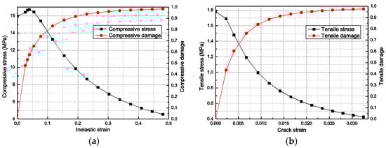 Concrete experiences damage when the stress level reaches the failure stress. The damage causes the softening of the concrete material stiffness. Considering that concrete destruction is mainly caused by tensile damage, only the role of tensile damage was considered in this section. The damage can be expressed by the damage factor d. Accordingly, the relationship of Cauchy stress and effective stress is defined by:
