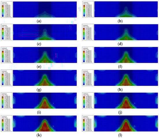 Figure 4 illustrates various tensile damage contour plots of concrete beam at different impact times. A tensile damage value of 0 shows the elastic behavior of concrete. More specifically, the values from 0 to 0.7 denote the formation of micro-cracks that are very small and invisible; the values from 0.7 to 1 indicate that macro-cracks emerge in the concrete; a tensile damage value of 1 means complete concrete failure. At the first impact loading, some slight damage starting from the bottom of the specimen appeared, but the initial damage of the concrete structure, as shown in Figure 4a,b, is invisible and undiscoverable by the naked eye. In order to ensure the safety and stability of the structure, it is important for us to discover in a timely manner the incipient damage generation and guard against the damage propagation. With the increase in impact times, the crack and damage gradually grew to the top surface along the central axis of the concrete beam and local damage in the mid-span of the beam became obvious. As seen from Figure 4i, the beam could be considered broken along with the twelfth times’ impact load application.