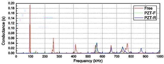 In order to ensure the detection sensitivity of the EMI-based technique, the conductance (real part of the admittance) was scanned with a wide sweep range from 1 kHz to 1 MHz to confirm a suitable frequency range at the beginning of the numerical experiment. It is obvious that the conductance signature has a more direct relation to the resonant frequency than admittance signature and susceptance signature. This is the reason why conductance was chosen for this scan. The test results of the conductance spectra are plotted in Figure 5. The red line is the conductance spectra when the PZT patch was free in the air, whereas the green line and blue line are the signatures when the PZT patches were bonded on the front surface and right surface, respectively. In the free condition, the first six resonant frequencies of the PZT patch were excited. In the interaction condition between PZT patches and the host structure, the conductance amplitudes at the first three resonant frequencies were significantly suppressed. However, the fourth resonant frequency shifted from 550 kHz to 560 kHz, and the conductance peaks slightly increased at the same time when the PZT patches changed to the interaction condition from the free condition. This is because the bonding of PZT increased the system stiffness. The result indicates that the excitation signal at the frequency point of approximately 560 kHz was sensitive to the structure mechanical properties changes. Therefore, a frequency range from 550 kHz to 580 kHz was chosen as the sweep frequency band for the scanning of the impedance and admittance spectra during the EMI-based impact loading damage detection test.