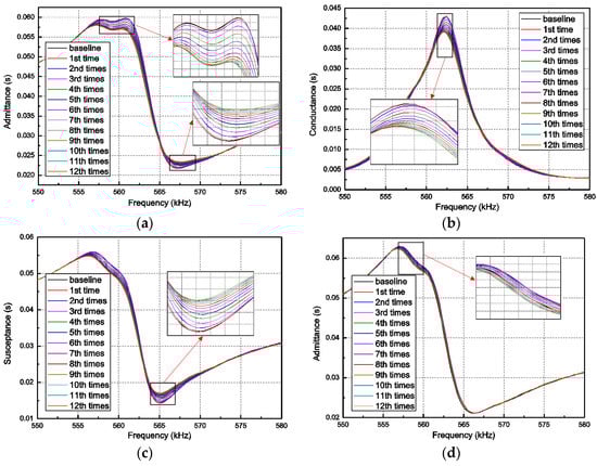 Admittance signatures in different impact load case: (a) Admittance of PZT-F; (b) conductance of PZT-F; (c) susceptance of PZT-F; and (d) admittance of PZT-R.