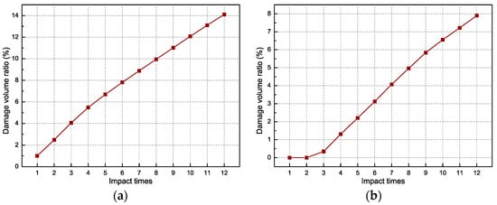 where denotes the th element in the finite element model, is the total number of elements, and and are the tensile damage factor and volume of the th element in the model, respectively. Figure 7a plots the global damage volume ratio with the increasing of impact times. As can be seen, the damage volume ratio grows linearly with the increase of the impact times. To further understand the concept, the damage volume ratio with a damage factor d > 0.7 was used to depict the local damage of the concrete beam, which can be observed in Figure 7b. The damage factor 0.7 is a crucial threshold which demonstrates the severe damage in the mid-span of the concrete beam. After the third impact loading acted on the beam, the DVR started to increase linearly. This denotes that wider cracks begin to emerge due to the concrete yield.