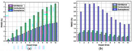 All of these parameters’ variations and analyses in the previous section demonstrate the impact damage evolution to some extent. However, the results from the conductance signatures are, so far, qualitative. To account for the variations in the admittance curves during the repeated impact loading, the RMSD index is applied to evaluate the impact damage quantitatively, as shown in Figure 8. For the results of PZT-F, the statistical indicator RMSD for these parameters shows a similar trend that was increasing with the repeated impact, illustrating that there was increasing damage inside the concrete sample. The RMSD metric for conductance (the real part of admittance) shows the highest sensitivity and the rest are of low sensitivity. As observed in Figure 8a, the RMSD of the conductance has the higher percentage in the course of impact, which almost double those values of the other two parameters. Nevertheless, the RMSD index of the admittance signatures obtained by PZT-R does not present the distinct rule along with the impact times, as displayed in Figure 8b.