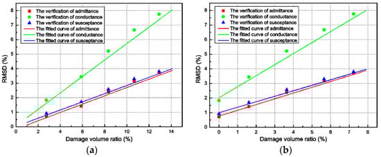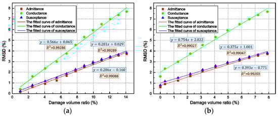 In order to further associate the RMSD of admittance signatures with the damage level of the concrete beam, the RMSD-based damage volume ratio is proposed. The two kinds of damage volume ratio, global damage, and local damage, are chosen to build the relationship with the RMSD of the admittance signals of PZT-F, as depicted in Figure 9. According to the distribution characteristics of these key points, the linear relations were fitted. By observing the pictures, the fitted relationship curves have a good fitting degree, which is more than 0.99. Take the green line from the Figure 9a as an example: if the RMSD of conductance signal was obtained, the damage volume ratio can be determined using the formula . In this way, the global damage degree of the concrete beam can be determined.