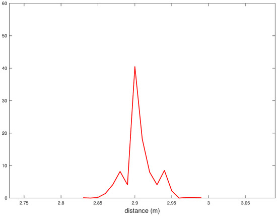In Figure 3, the probability Density Function (PDF) of the distance estimates , relative to a true distance of m, is shown. It can be shown that the probability mass concentrates in a m-range around m. In other words, there is a m offset with respect to the true distance. The statistical model derived in the following aims at systematically correcting this offset. Let us define as the average value of the range errors relative to the true distance :