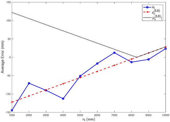 where is a matrix where the th element of its first column is , and the elements of its second column are all equal to 1; the th element of is (its value depends on the collected experimental data); and is the solution vector. Applying the LS technique to solve the system of Equation (5), one obtains that the LS linear approximation of the average range estimation error can be expressed as