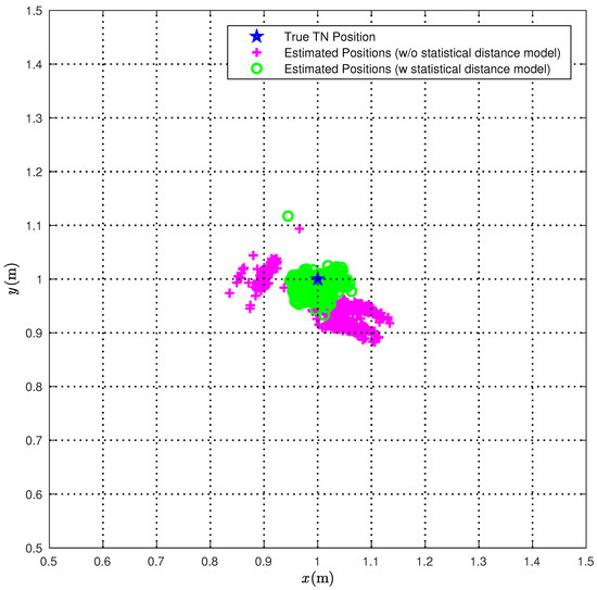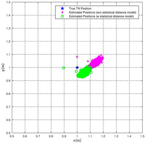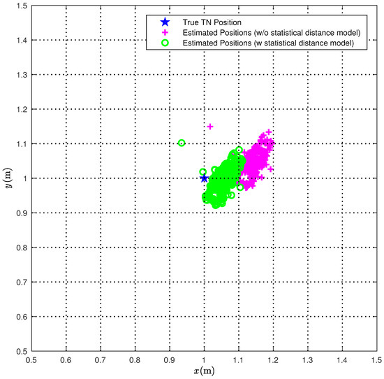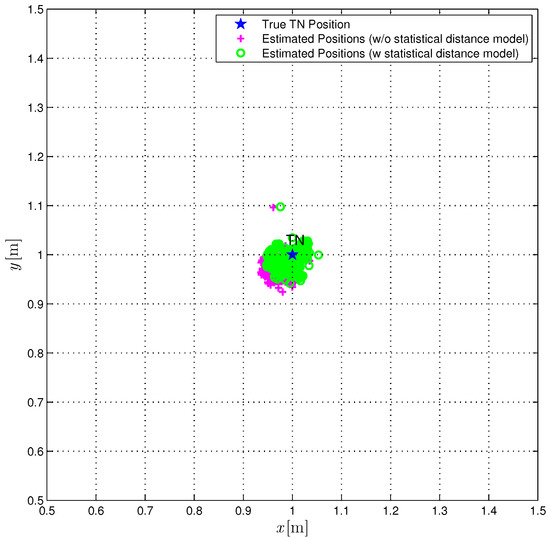In Figure 10, we directly compare the true TN position (red star) with the position estimates obtained according to the CI algorithm over 1000 iterations with (green circles) or without (magenta pluses) the correction (22). The obtained results show that the use of the proposed statistical model improves significantly the performance accuracy of the CI localization algorithm.