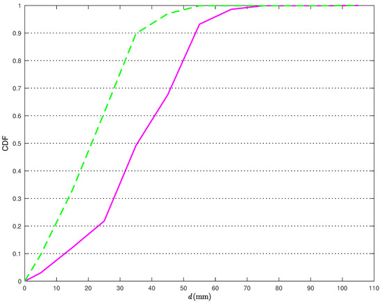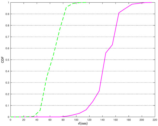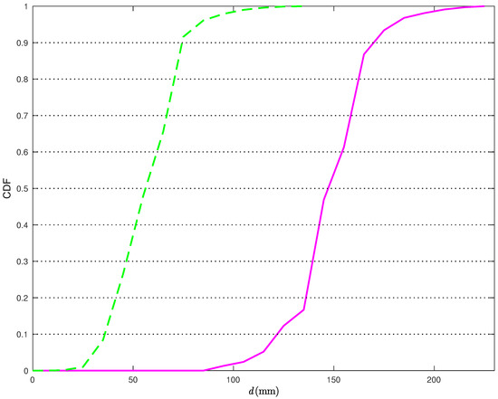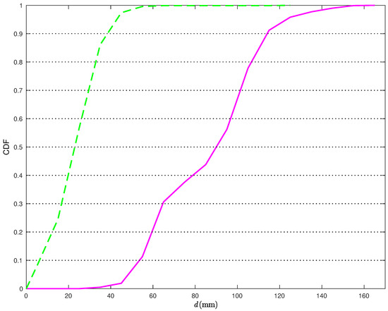 The true TN position (red star) is compared with the position estimates obtained over 1000 iterations with (green circles) or without (magenta pluses) the correction (22). From Figure 8, it can be observed that the use of the proposed statistical model improves the performance accuracy of the TSML localization algorithm as well, even if in this case the improvement is limited. In Figure 9, the CDFs of the distances between the true TN position and its estimates (obtained according to the TSML algorithm) are shown. In Figure 9, the performance of the TSML localization algorithm is investigated. More precisely, the solid line is relative to the position estimates obtained without the statistical model for the distance estimates, while the dashed line is relative to the position estimates obtained using the corrections (22). Unlike Figure 7, the two CDFs are similar and the distance error turns out to be smaller than 60 mm, more than of the times even without correction. Considering a probability equal to 0.9, the relative reduction of the average distance estimation error, using the proposed statical model, is around 33%. As a matter of fact, from the third column of Table 2, it can be observed that the value of is only 14 mm smaller (corresponding to a reduction of ) than , while the value of is only 3 mm (corresponding to a reduction of ) shorter than .