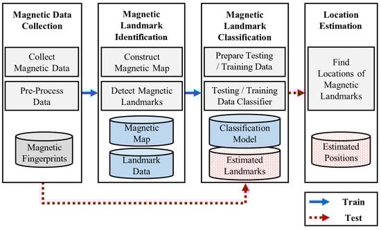 This step consists of data preparation, feature extraction, classifier training, and location estimation. Data preparation is performed to provide inputs for each phase. Both phases undergo domain conversion depending on the type of magnetic data received. The magnetic data separation allows magnetic sequences that match magnetic landmark to be extracted from the data. Additionally, in the training phase, location-labeling of training data for supervised learning is performed. After the feature extraction, which determines the features for the DNN classifier, the DNN is trained and tested to estimate locations.