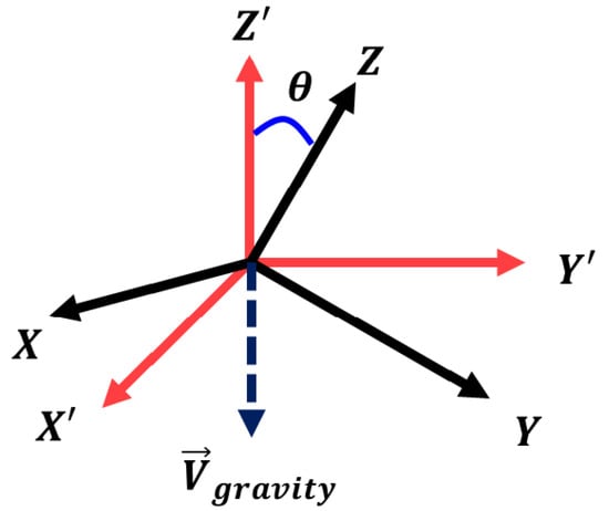 In Equation (1), Z represents a unit vector of the Z axis (0,0,1), and is opposite to the gravitational vector that can be obtained through an API in the smartphone operating system [,].