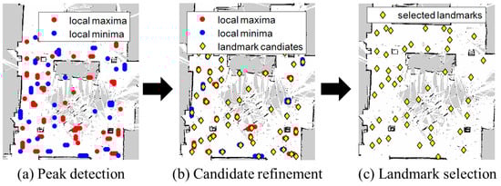 Landmark detection consists of local minima/maxima (peaks) detection, magnetic landmark candidate refinement, and magnetic landmark selection as shown in Figure 4. By finding the peaks on the map, magnetic landmark candidates are chosen. Then magnetic landmark candidate refinement removes outliers that are caused by low-quality smartphone sensors and the indoor environment. Finally, magnetic landmark selection finds landmarks by analyzing magnetic sequence patterns.