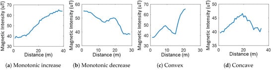 In Equation (2), m and denote the magnetic map before and after the smoothing, and, f denotes the smoothing filter. Parameters a and b determine the degree of smoothing.