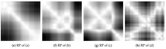 - RP: RP is usually used to analyze shapes or patterns in time series data []. We use the RPs to identify shapes in a magnetic sequence. This is the first case where an RP is used as an image feature to estimate locations. The image feature can be obtained by applying the RP as follows:where m denotes the magnetic data element in the distance domain. Because some sequences have extremely long data length, we set the maximum sequence length to seven meters which covers over 90% of sequences. R is a normalized Euclidean distance matrix that finds all distances among all components. The RP is free from offsets of the sensor readings among smartphones because the RP only calculates gradient among the data elements.The RP generates unique images depending on the shape of curves as shown in Figure 5. The four images in Figure 5e–h are generated from the magnetic sequences in Figure 5a–d. For example, the shape of a straight line as shown in Figure 5a is the case where the trend is monotonic increase or decrease. Figure 5h shows the case where the shape of the magnetic sequence has convex or concave curve. Finally, other images have complex curve shapes in which the magnetic data have one or more fluctuations.