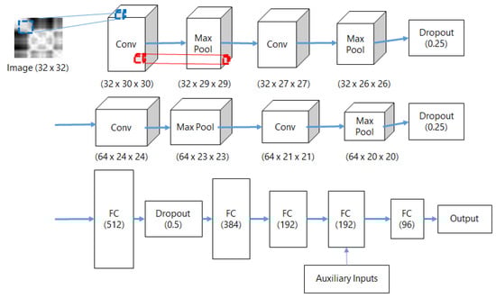 The structure of a DNN classifier consists of a convolution neural network (CNN) for analyzing image features, and a multi-layer perceptron (MLP) for magnetic landmark classification as described in Figure 6. Every RP is converted to a 32 × 32 size image as an input to the CNN. The CNN structure for analyzing the RP is similar to the CNN structure of the simplified CIFAR-10 dataset classifier. We use two sets of layers that consist of two-dimensional convolution filters, activation function, max pooling layer, and dropout units. Because we append the MLP at the end of the CNN, the final fully connected layer is removed. The MLP receives inputs of size 256 from the CNN and three auxiliary features of size 5. We designed the MLP as cascading fully connected layers that starts from an FC layer of size 196, because we detected up to 99 magnetic landmarks in our test environment. The final layer of the MLP has a size that corresponds to the number of magnetic landmarks in the environment. The DNN classification model is trained with backpropagation. To predict landmarks, features are extracted from classification data and fed to the trained model. The locations are estimated from the locations of predicted landmarks.