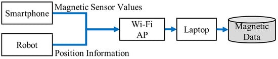 A magnetic data collecting system is implemented to generate classification data for training. The design of the system is shown in Figure 7. We use KOBUKI, an ope-source robot []. The robot is controlled with a laptop (Asus TP200S, ASUS, Taipei, Taiwan) that runs ROS Indigo on Ubuntu 14.04. To collect magnetic sensor data, we use a smartphone (Nexus 6P, Huawei, Shenzhen, China) that runs customized ROS Android application. This application reads magnetic data at 100Hz and transmits the data to the laptop through a Wi-Fi connection using a mobile AP. In order to localize the robot, LIDAR-based SLAM is used: Google Cartographer [], and Gmapping and AMCL from the ROS package. We use a URG radar (Hokuyo URG-04LX, HOKUYO, Osaka, Japan) that can detect the range from 20 mm to 5600 mm. For the test data, we installed magnetic data collection application on a smartphone (Nexus 6P).
